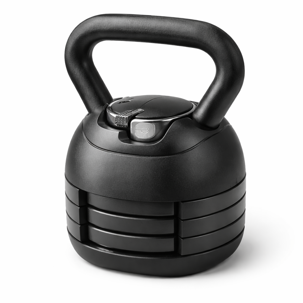 Solid and balanced feel with a smooth handle finish for comfortable grip. The adjustable design keeps the kettlebell compact while offering versatile resistance options.